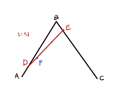 선분 AB와 BC 사이에서, 0~1사이의 값 t 만큼 비례한 점인 D, E를 찾는다.