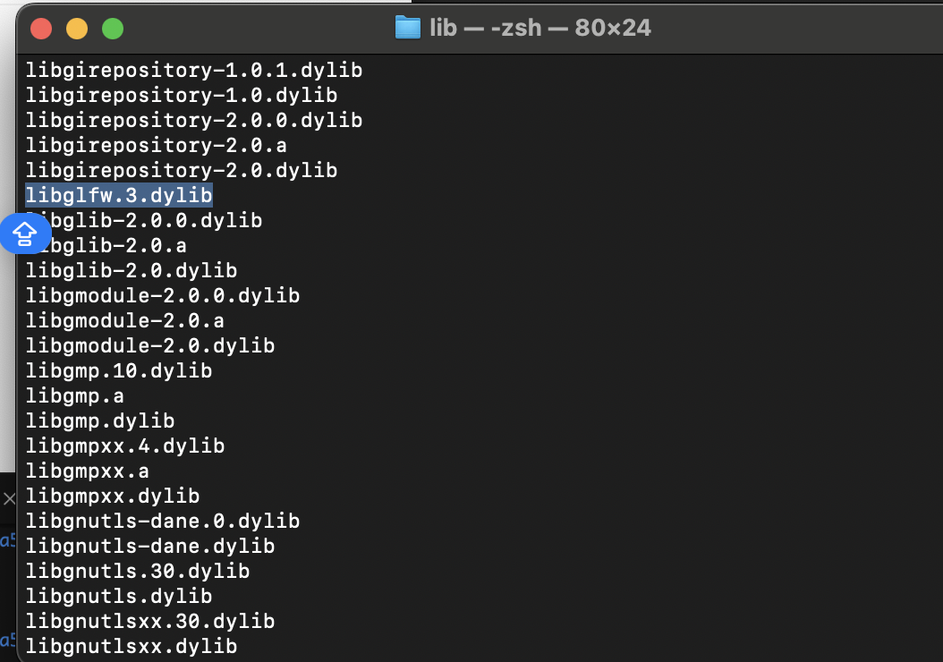 에러로그를 살펴보면 libglfw.3 동적 라이브러리 파일 경로를 못찾는다고 나온다.